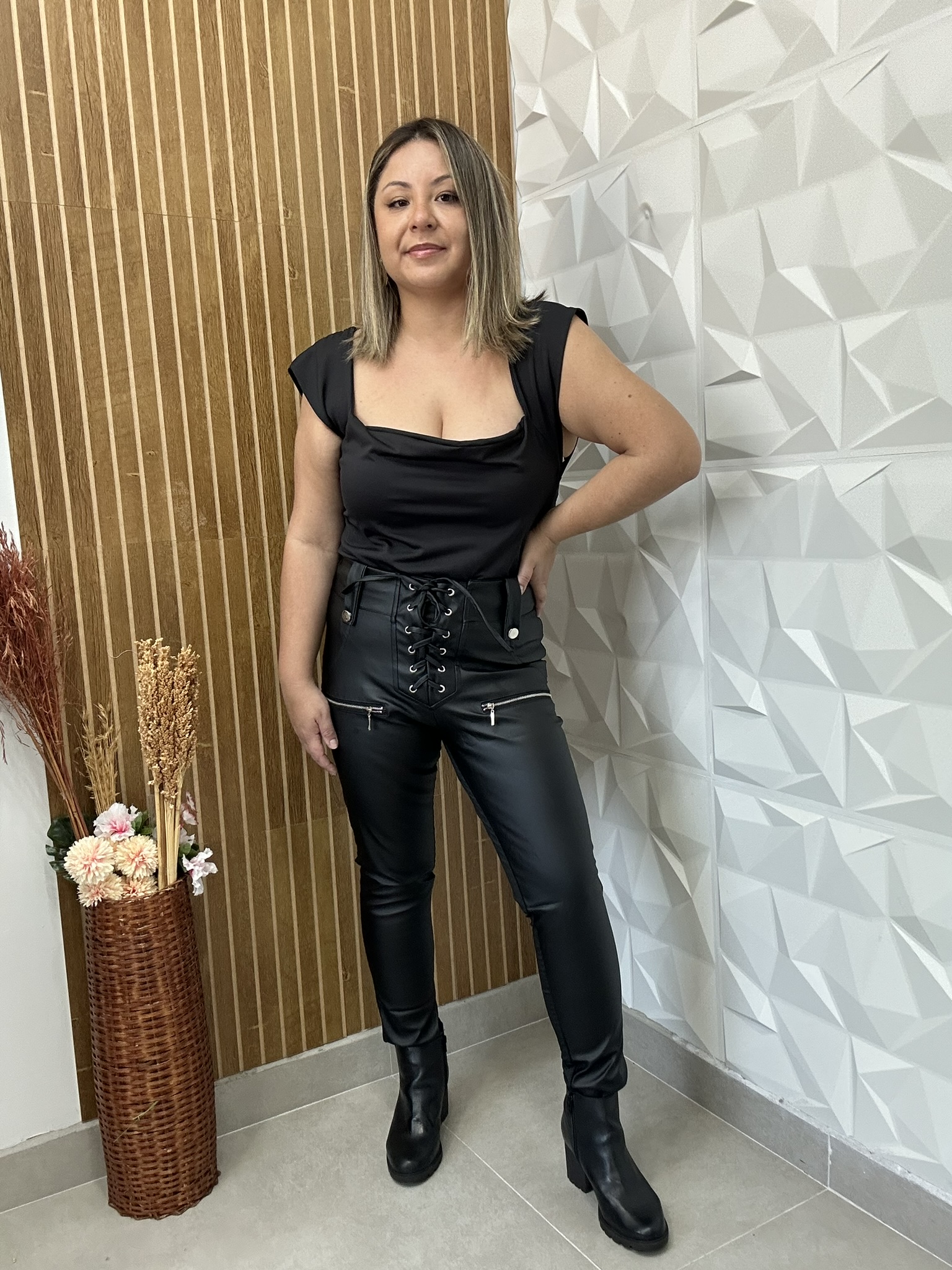 Transforme qualquer look com essa calça feminina em couro sintético que une modernidade e atitude. Com modelagem ajustada, ela valoriza a silhueta e é perfeita para criar produções estilosas para o dia ou noite.